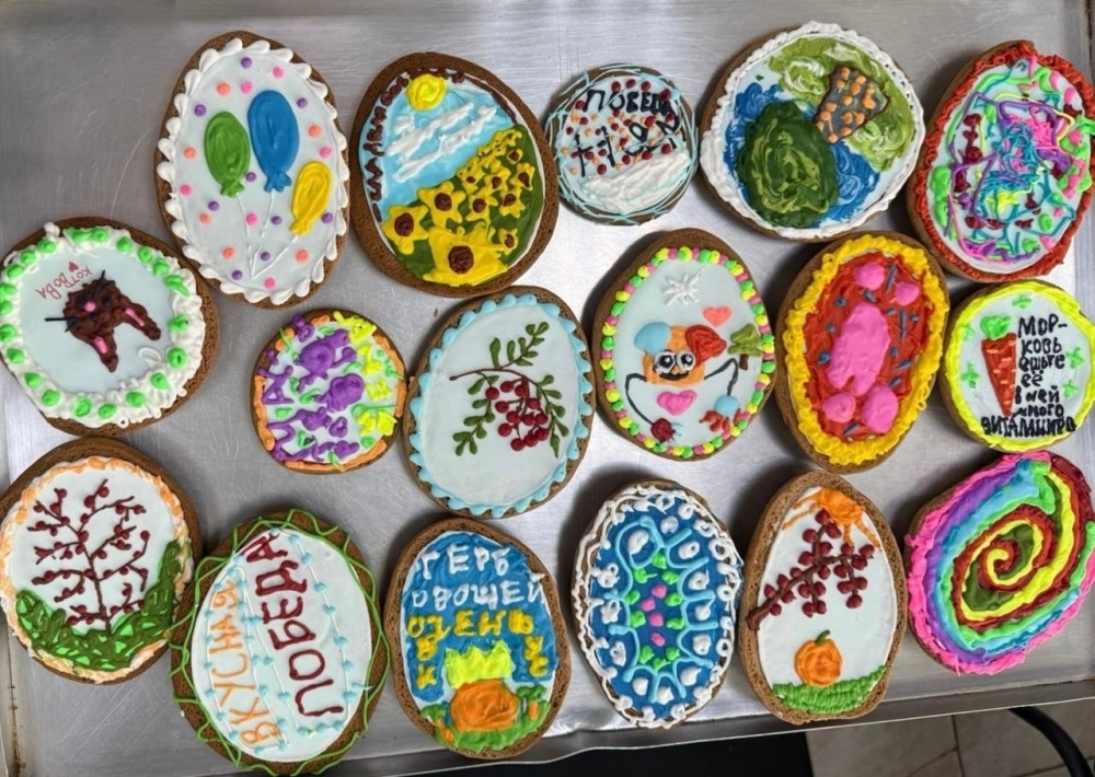 Несколько дней прихожанки выпекали имбирные основы для пряников, расписывая их в осенних мотивах: желтыми и багровыми листьями, гроздями рябин. А ученики приходской воскресной школы храма под руководством педагога Изо Ольги Титовой и завуча Ольги Сипаковой дали волю фантазии, чтобы порадовать наших бойцов.